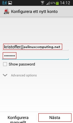 I dialogrutan Konfigurera ett nytt konto skall man ange sin e-postadress och sitt lösenord. Klicka därefter på knappen Nästa.