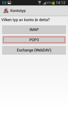 I dialogrutan Kontotyp skall man ange kontotyp. Man kan välja antingen POP eller IMAP. I de flesta fall väljer man POP. Har man emellertid behov av att använda flera olika e-postprogram, och vill använda sig av en anpassad mappstruktur för att lagra sina brev är IMAP ofta ett bättre val. IMAP används för att läsa e-postmeddelanden som lagras på servern, och man måste därför själv se till att det lagringsutrymme man tilldelats på servern inte överskrids.