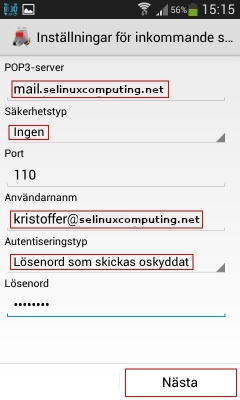 POP3-server anges till mail.selinuxcomputing.net Säkerhetstyp anges till Ingen Användarnamn anges till aktuell e-postadress Autenticeringstyp anges till Lösenord som skickas oskyddat