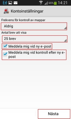 Frekvens för kontroll av mappar 5 min Antal brev att visa 25 Meddela mig vid ny e-post Kryssas i Meddela mig vid kontroll efter ny e-post Kryssas inte i