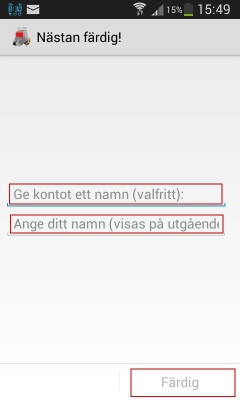 I dialogrutan Nästan färdig skall man ange ett valfritt kontonamn och sitt namn. Namnet visas som avsändare i sända e-postmeddelanden. När man fyllt i sina uppgifter klickar man på knappen Färdig.