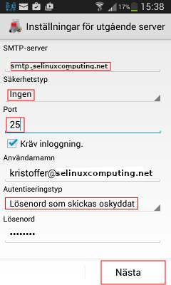 SMTP-server anges till smtp.selinuxcomputing.net Säkerhetstyp anges till Ingen Port anges till 25 Autentiseringstyp anges till Lösenord som skickas oskyddat